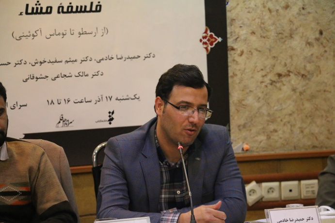 حمیدرضا خادمی گفت: «فلسفه مشاء در فلسفه اسلامی با محوریت ابن‌سینا نوشته می‌شود و در فلسفه یونانی هم ارسطو محور است. برای ما فارابی و ابن‌رشد در فلسفه مشاء غایب هستند که این اشتباه است».